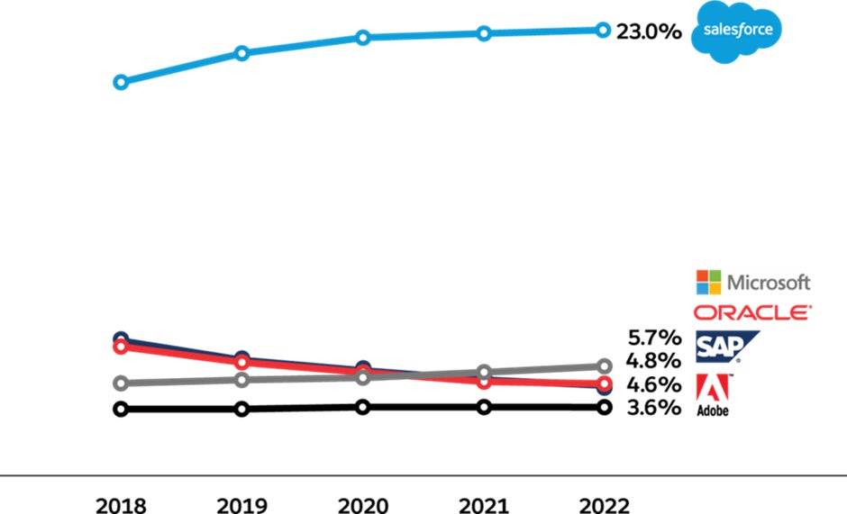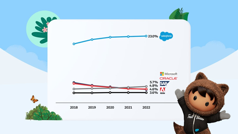2022年のSalesforceの売上は前年と比べてCRMベンダーの中で最も伸長し、世界全体のCRM市場でシェアが拡大しました。