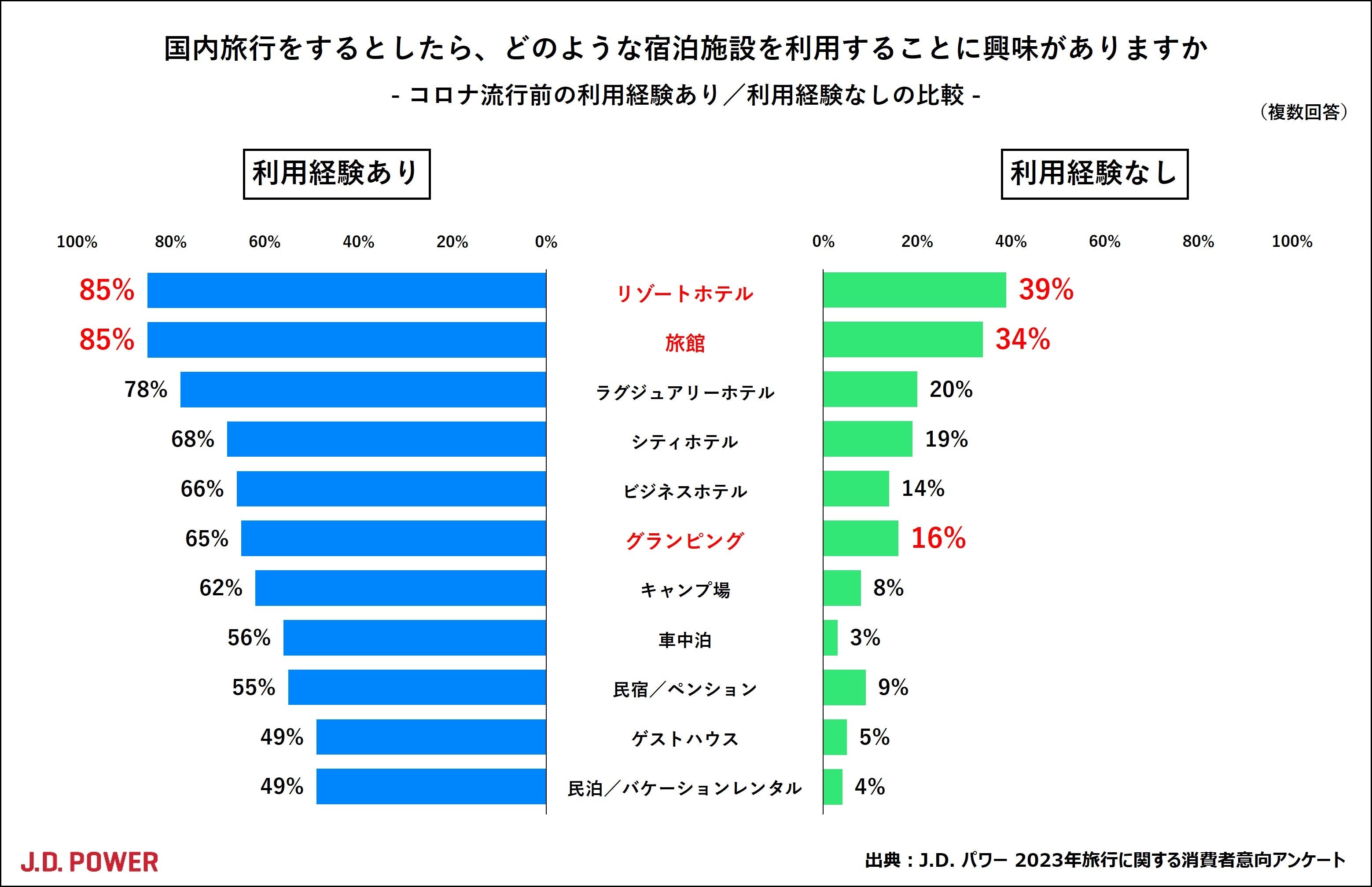 一方、コロナ前に利用したことのない場合はどうでしょうか。この場合でも「リゾートホテル」と「旅館」が上位を占めており、これまで利用していなかったという人からも、泊まってみたいという興味が示されているようです。