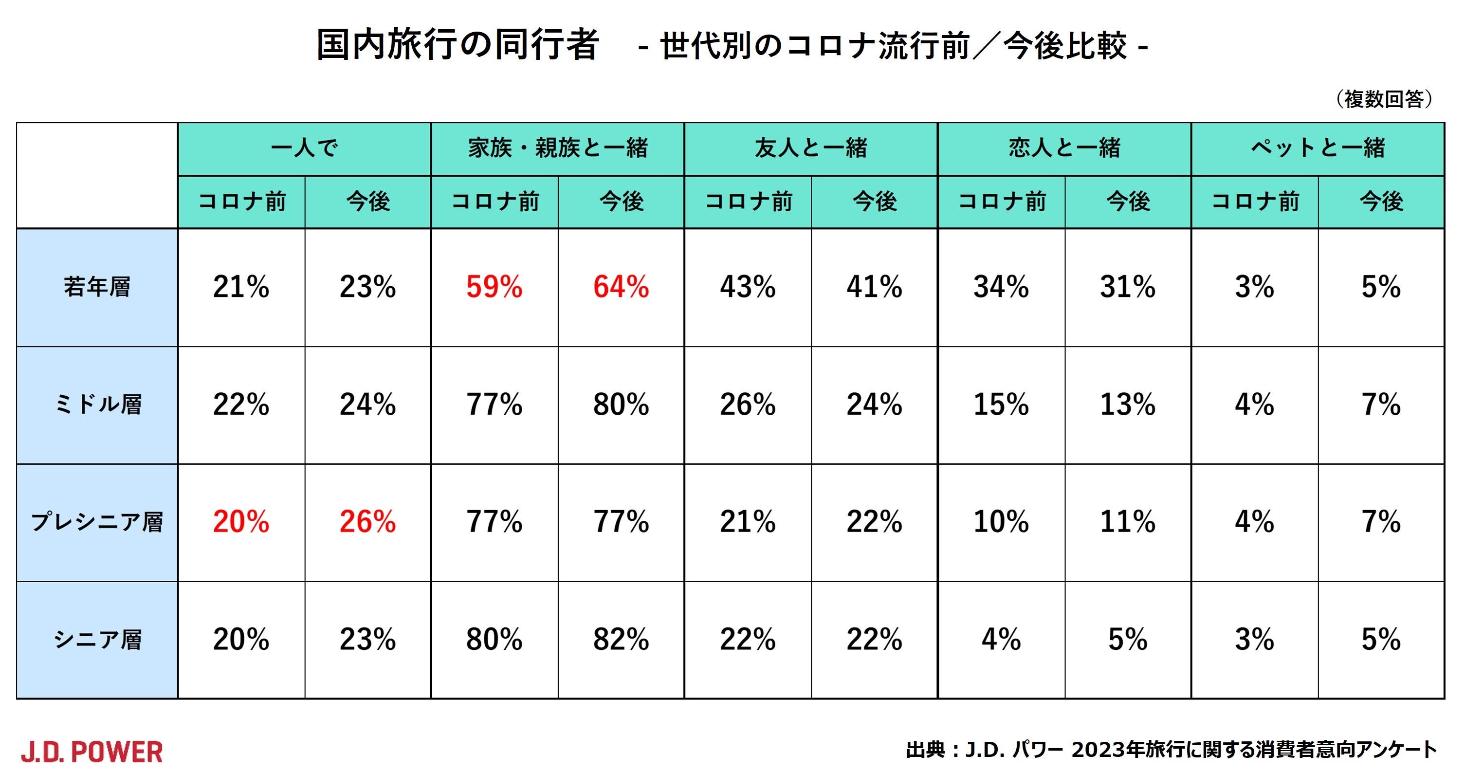今後の国内旅行の同行者、若年層では「家族や親族と一緒」、プレシニア層では「一人旅」がコロナ前と比べ増加傾向