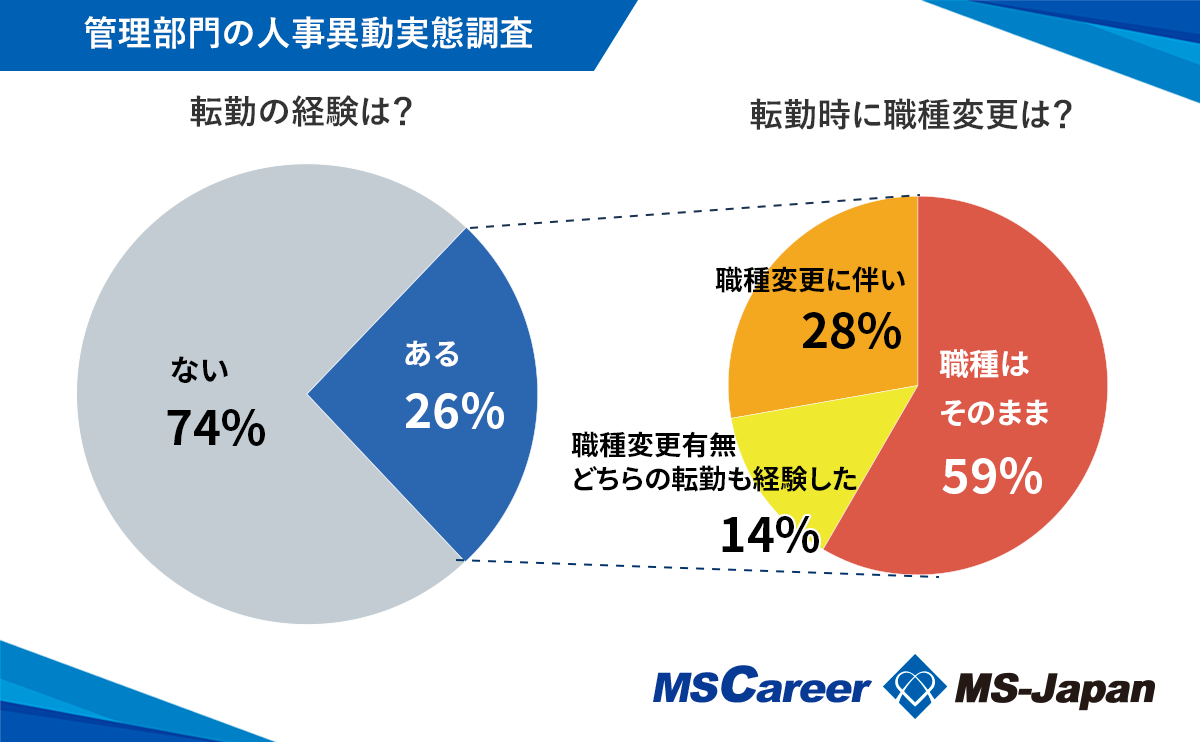 転勤経験に関する調査では、管理部門の26%は転勤経験が「ある」、そのうちの4割は転勤に伴い「管理部門以外への職種」への職種変更も行われたことがわかりました。