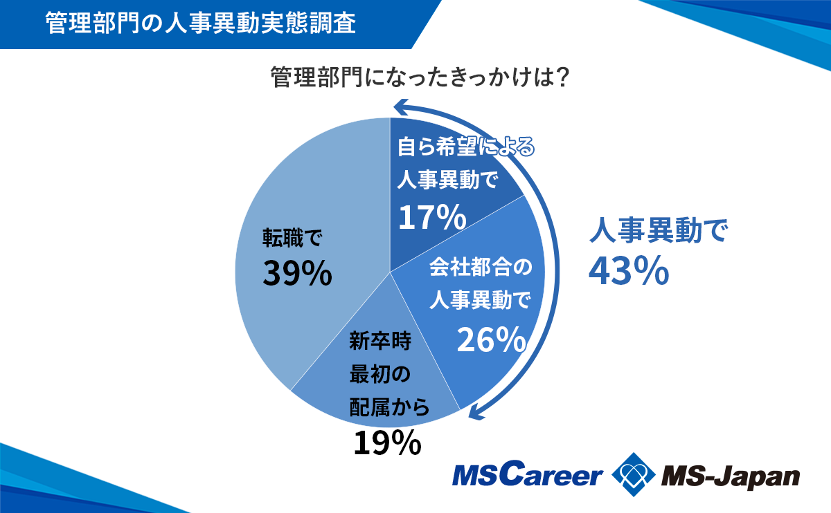 管理部門に就いたきっかけ第1位「社内の人事異動(43%)」、第2位「転職(39%)」