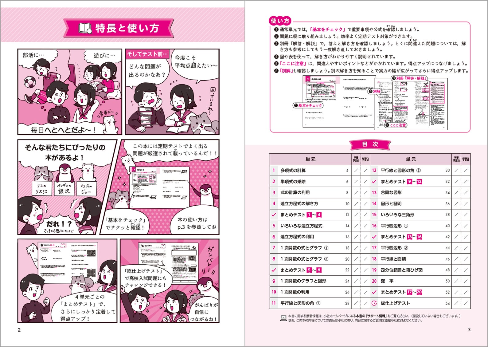 いろいろなパターンの問題を掲載しているので、定期テスト対策にぴったり。理解できたか確認できる「まとめテスト」を数単元に1回掲載して、はずせない基本問題を効率よくマスターしていきます。
