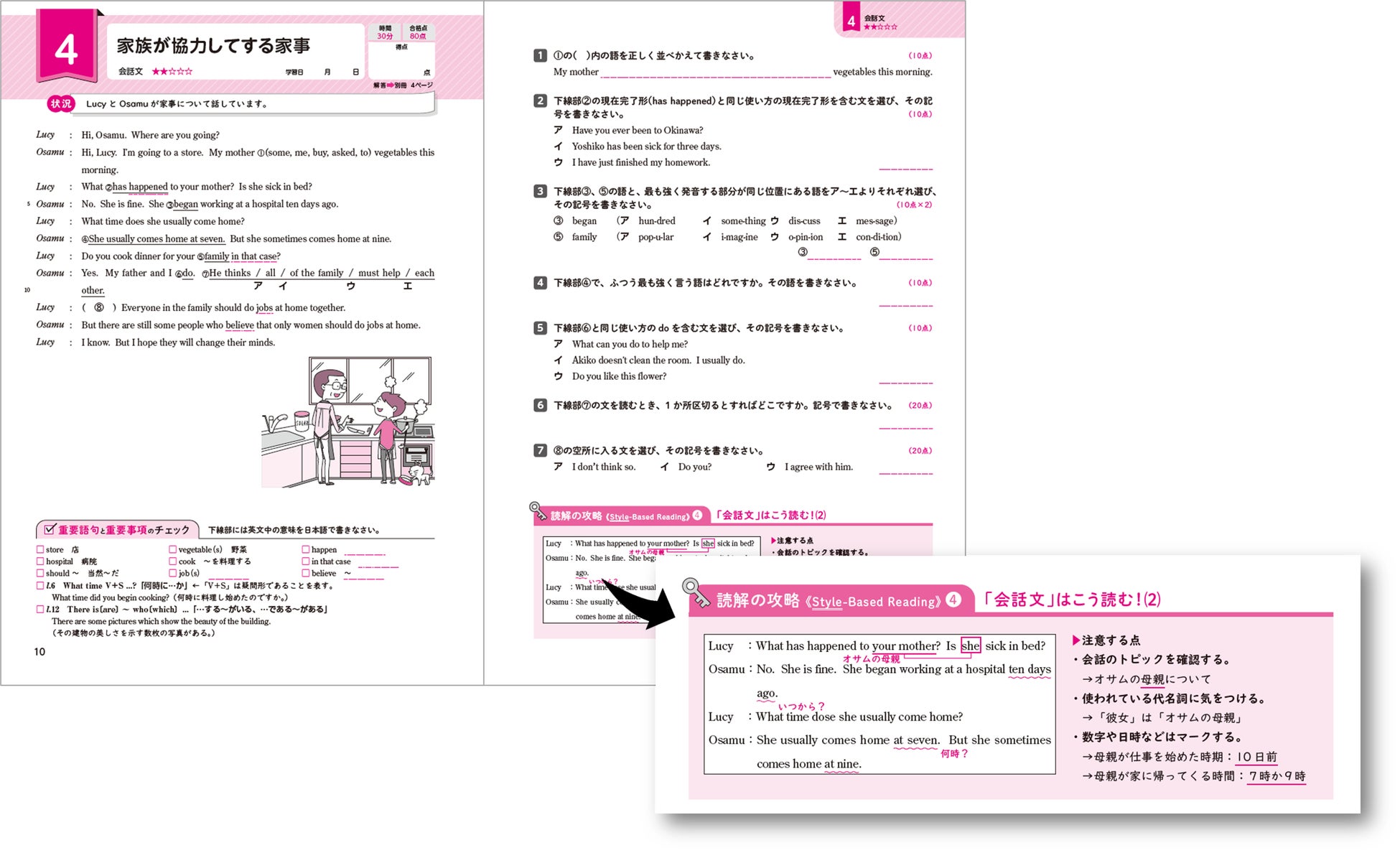 ▶1単元は2~3ページ構成。身近なテーマを取り上げた文や会話文を読みます。