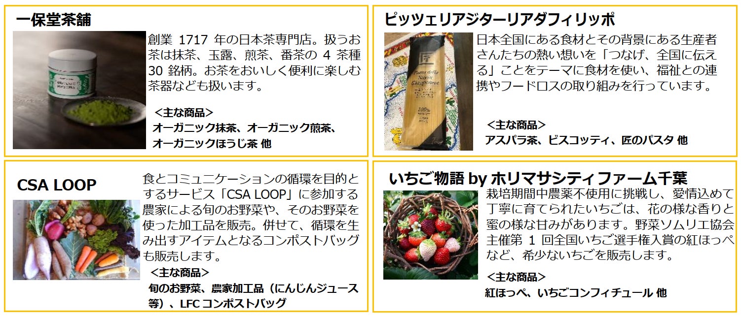 かほくらしグランマルシェ(イタリア野菜他)/MEAL MAN(いちこマフィン各種他)/ねまるちゃテラス(生はちみつ他)/はるセレクション・もったいないフルーツショップ(高知の小夏他)/ Connect Farm(れんこん他)ふくい食の國291(なつめのど飴他)/カトレヤフィールド(殻付きアーモンド他)/鎌倉小町通りプリン(鎌倉小町通りプリン他)