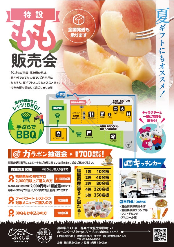 BBQにご参加いただいた方、道の駅ふくしま内フードコート・レストラン内の限定メニューを購入いただいた方、および、福島県産の桃をふくむ2,000円以上お買い上げのお客様が対象。
