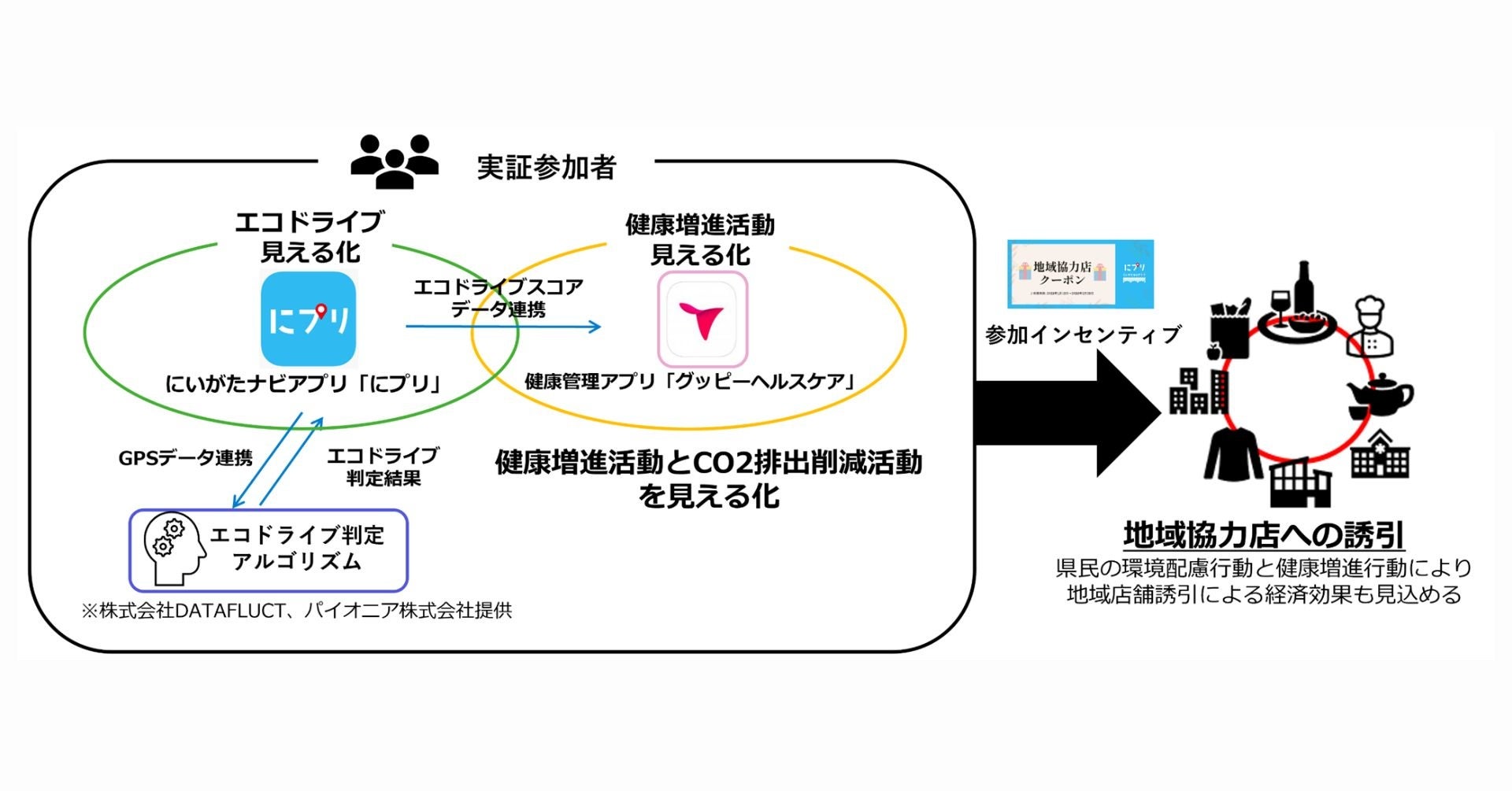 実証実験では、新潟市内の協力事業社社員を対象に、運動・歩行等の個人の健康データから健康増進活動を可視化してポイントを付与し、GPSデータから環境に配慮した運転(エコドライブ)を確認できた場合にもポイントを付与します。ポイントから地域内で利用可能な飲食店クーポンを発行することで、 クーポン利用による地域内消費活性化にもつなげます。