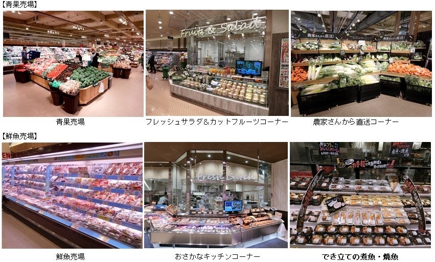 生鮮品売場では、お客様に満足していただける鮮度の良い商品を品揃えします。特に新鮮な野菜・果実を使った、作り立ての「サラダ」「カットフルーツ」や店内で販売しているお魚やお肉をオープンキッチンで調理したでき立ての「煮魚・焼魚」、焼き立ての「お肉総菜」などを提供します。