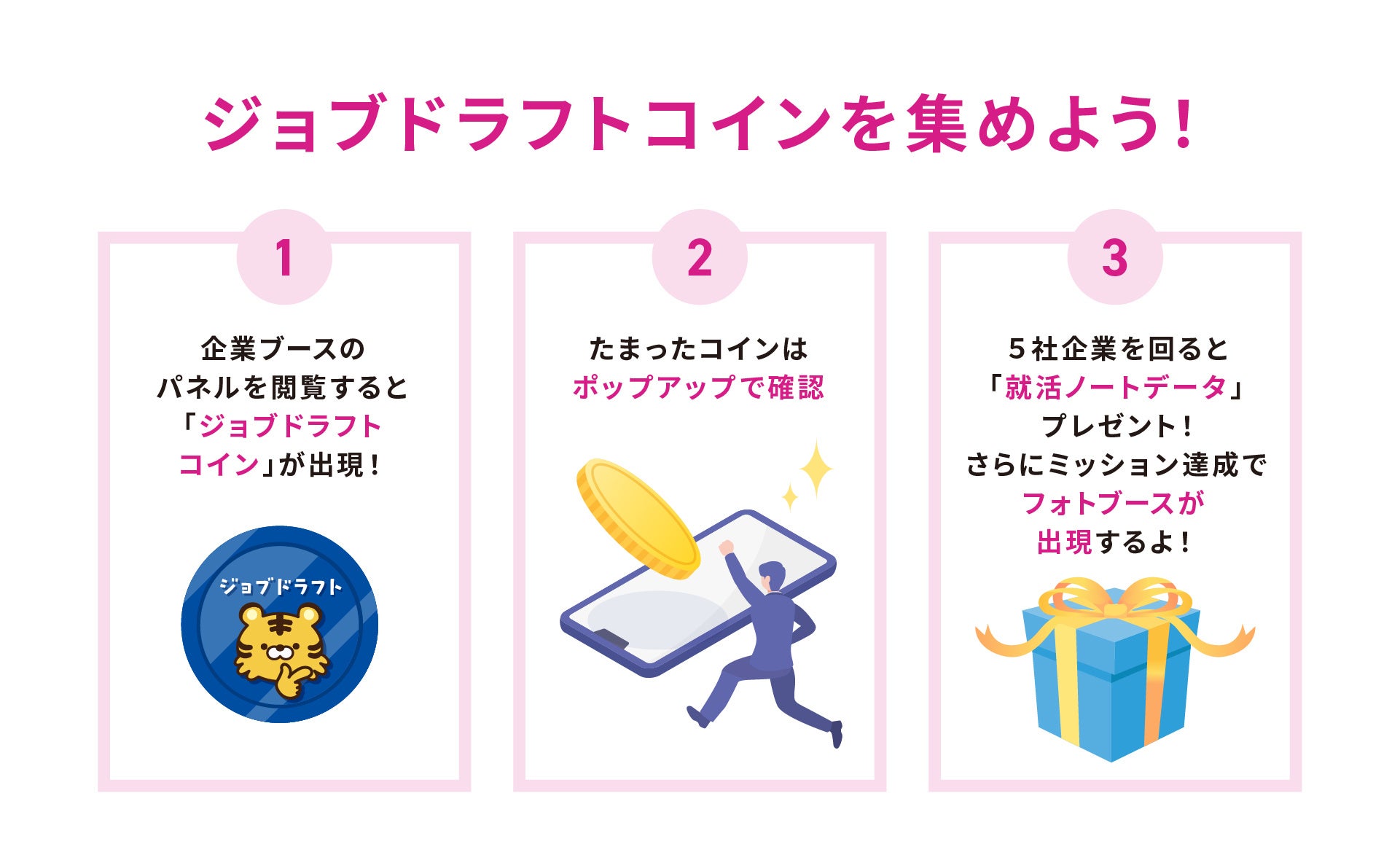 企業ブースを回るともらえる「ジョブドラフトコイン」が出現するなど楽しみながら参加ができます。