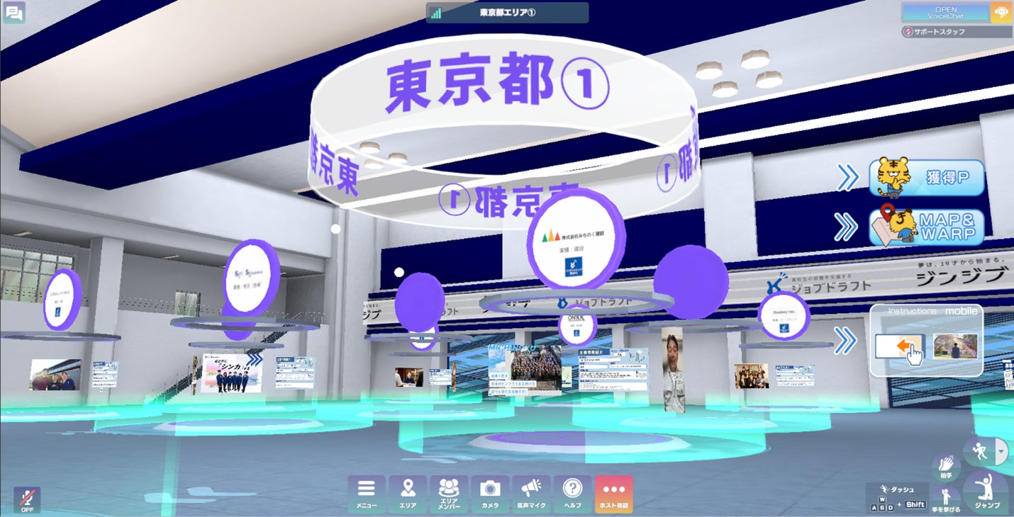 全国20エリアの仮想空間を用意しています。高校生はアバター利用し自由にエリア移動しながら、気になる企業ブースへ訪問をすることができます。企業ブースには「ジョブドラフトNavi」の企業ページへのリンク、企業紹介パネル、動画などを紹介します。