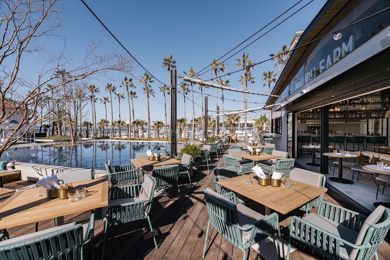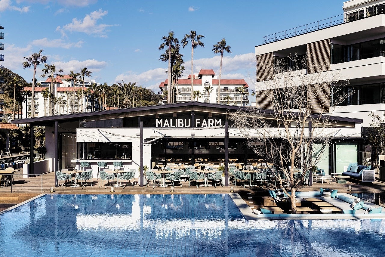 『マリブファーム 逗子マリーナ』では、現地の人気メニューの他、地元湘南の新鮮野菜や相模湾の魚介類を使用した日本限定メニューもご用意しています。全開可能なサッシによりテラス席と内部が一体となる設えで、約50席の屋内席の他、マリーナの海から繋がるような大きな水盤が広がる約80席のテラスには、三方を水に包まれたウォーターテラス席や、暖炉を囲むファイヤーテラス席などシチュエーションに応じてお使いいただけます。豊富なテラス席を有するため、ペット同伴でのお食事に最適なレストランです。