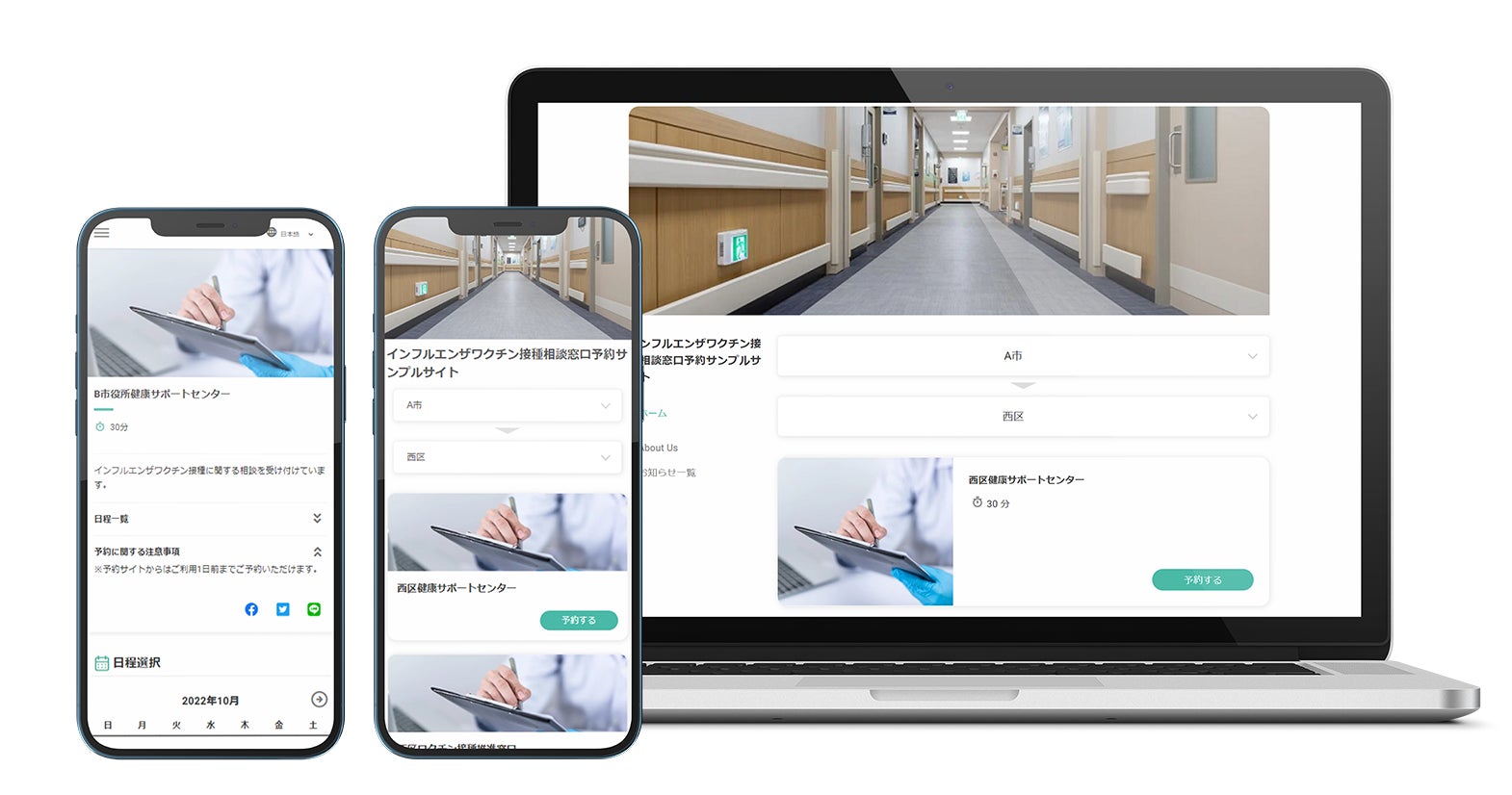 当社では、医療機関・クリニックで導入できる「インフルエンザワクチン接種」の予約受付に対応した予約システムの提供も行っています。自治体がインフルエンザワクチン接種を実施している医療機関・クリニックと連携することで、接種までのスムーズな流れを実現できます。詳細は以下をご確認ください。