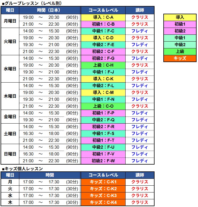 *ご自身のレベルと合わなかった場合はコースの変更が可能です(講師の変更が伴う場合は開始後2週間まで。講師が同じ場合はクラスに枠があれば受講期間中は変更できます)