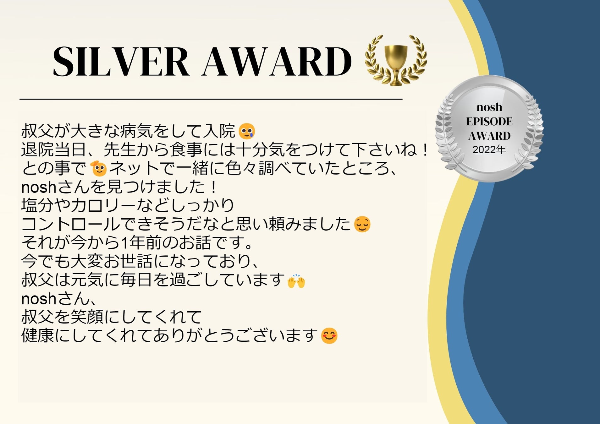 ご親戚の方が大きな病気をされたうえに、食事に気を付けないといけないという状況は大変ご不安もあったかと存じます。そのような中で、noshをご利用いただき、元気に笑顔でお過ごし頂けている素敵なエピソードだと思い選ばせて頂きました。