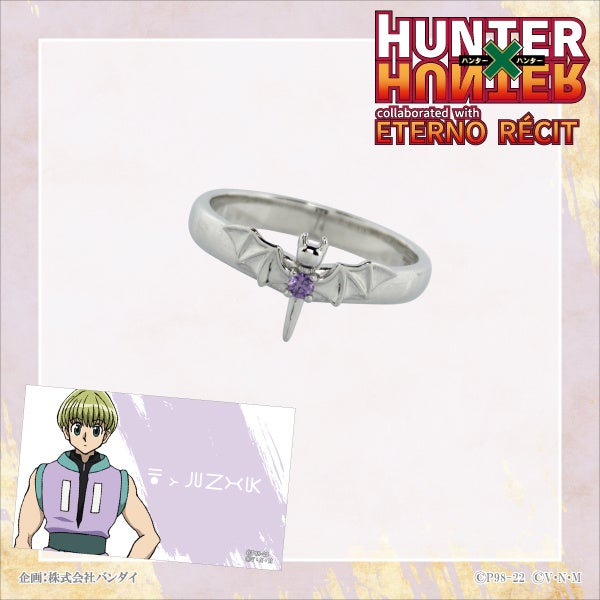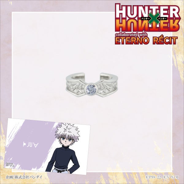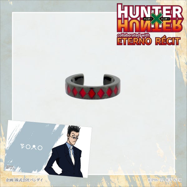 「HUNTER×HUNTER×エテルノレシ モチーフイヤーカフ」は、ゴン、キルア、レオリオ、クラピカ、ヒソカ、クロロの6種展開、「HUNTER×HUNTER×エテルノレシ モチーフリング」はヒソカ、イルミ、カイト、シャルナーク、ネテロ、メルエムの6種展開です。