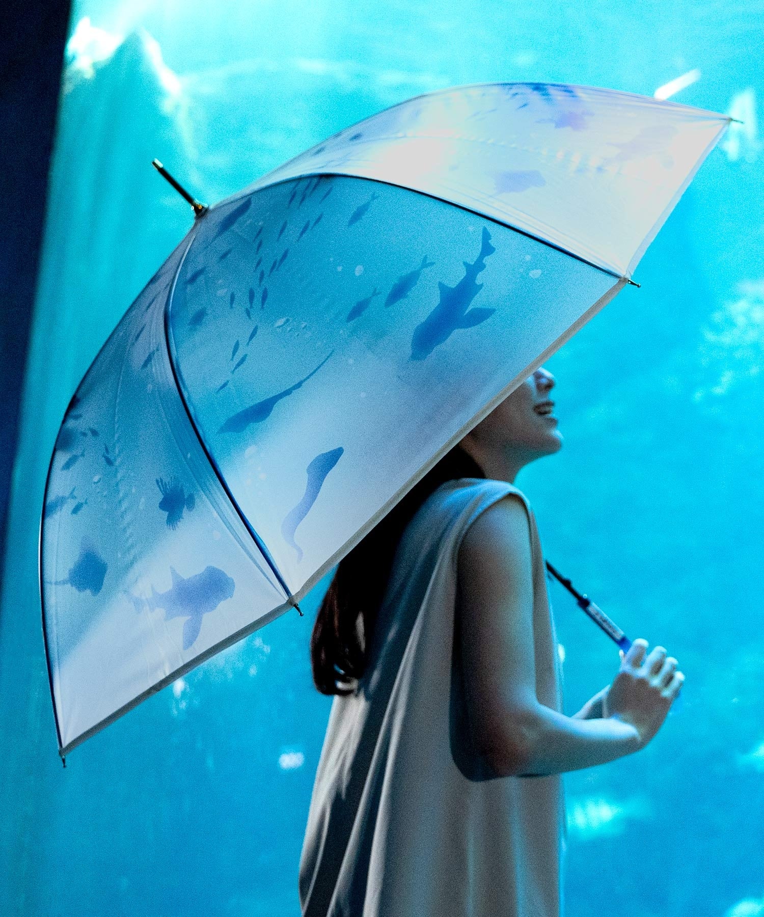 朝をテーマにした「おはよう、大水槽」は、新江ノ島水族館の水槽では最大規模となる”相模湾大水槽”を泳ぐ魚たちをイメージしたもの。傘全体を使ったダイナミックなイワシトルネードが特徴的で、大水槽を見た時のわくわくを思い出すようなデザインに仕上げました。