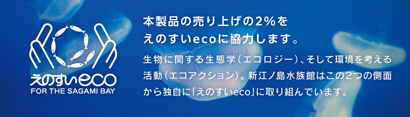 また本製品は、新江ノ島水族館が生物に関する生態学(エコロジー)と環境を考える活動(エコアクション)の2つの側面から取り組む「えのすいeco」に売り上げの2%を寄付いたします。