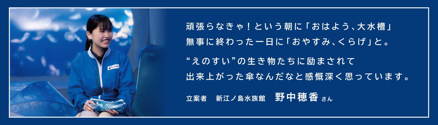 商品を企画したのは新江ノ島水族館商業チームの野中穂香さん。普段から新江ノ島水族館のグッズを考案されることが多いそうで、今回のコラボレーション傘は野中さんが”頑張らなきゃ!”という朝に大水槽の前で『おはよう』と、また無事に終わった一日に『おやすみ』と生き物たちに語りかけるエピソードから出来上がったもの。ものづくりをする上でお客様が「”えのすい”の思い出を持ち帰ること」を一番大事にしており、自分が手掛けたグッズがお客様の思い出を繋ぐものになれば嬉しいと話す野中さんです。