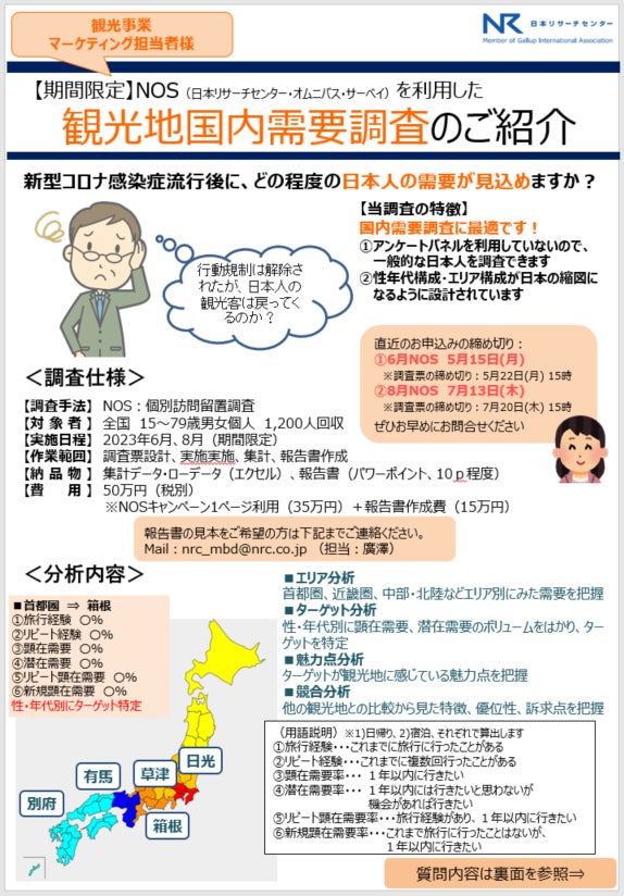 日本リサーチセンター(本社:東京都墨田区、代表取締役社長:杉原領治)は、国内観光地を支援するため「観光地国内需要調査の期間限定割引サービス」を2023年5月より開始します。