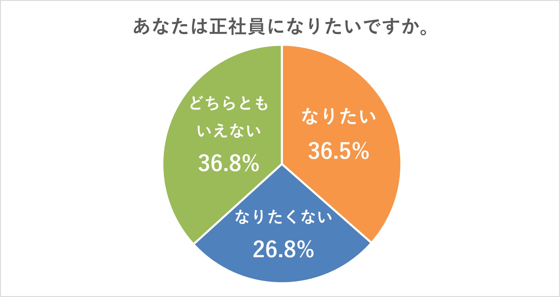 「正社員になりたいか」質問したところ、「なりたい」が36.5%、「なりたくない」が26.8%、「どちらともいえない」が36.8%となりました。