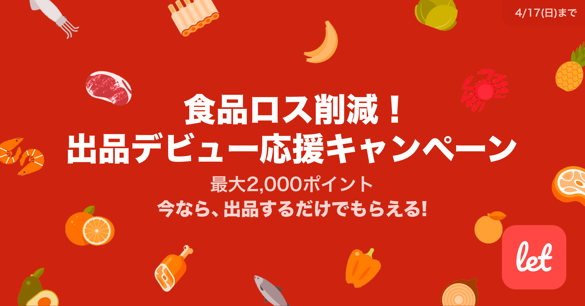 株式会社レット(本社:東京都港区、代表:佐藤 航陽)が運営する、食品ロス/在庫ロス削減のマーケット「Let(レット)」内で「食品ロス削減! 出品デビュー応援キャンペーン」を4月12日(火) 正午より開催します。はじめて「食品」を出品した方ならどなたでも、アプリ内のお買い物に利用できるポイント最大2,000円分をプレゼントいたします。レットでは最短1分で簡単に商品の販売が可能で、獲得ポイントはアプリ内の商品購入にご利用いただけますので、ご自身で生産されているお野菜や果物などの販売にこの機会を是非ご利用ください。