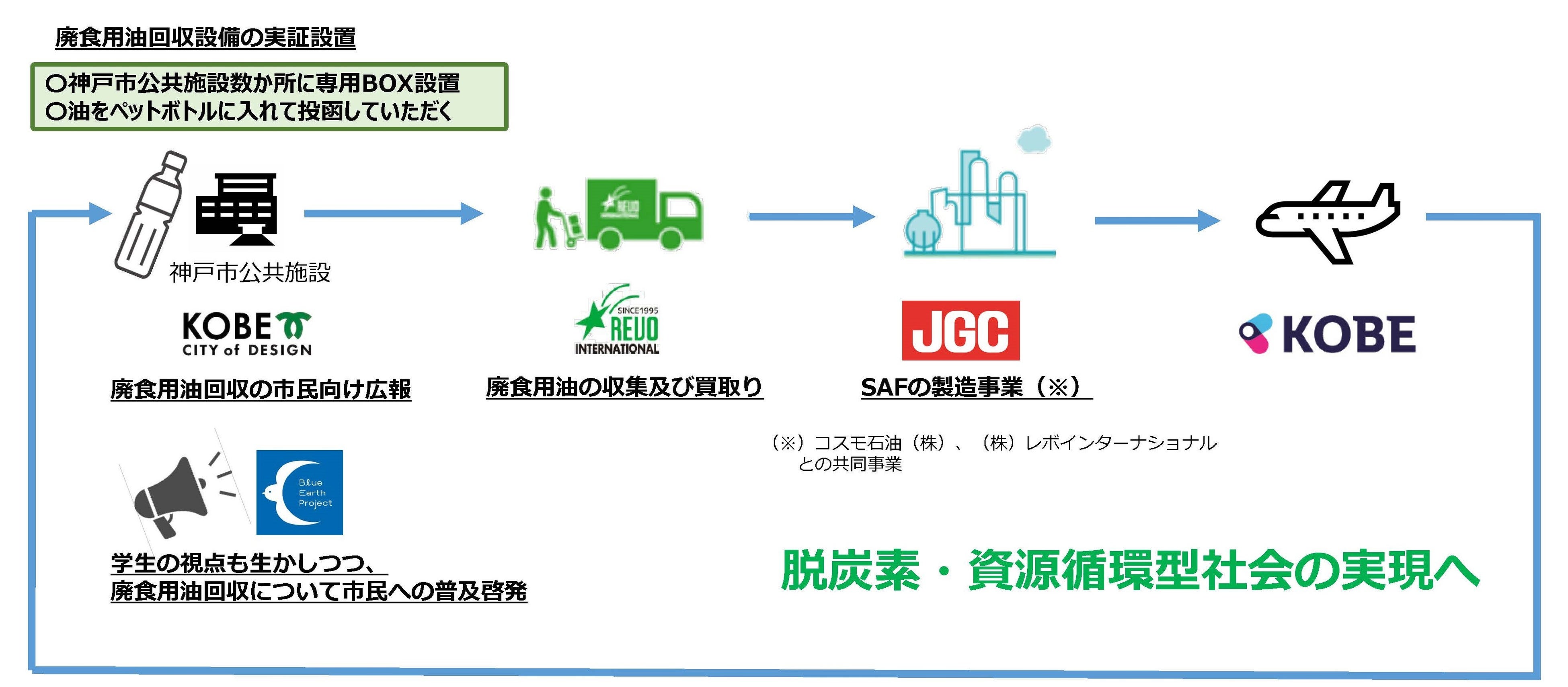 日揮ホールディングス株式会社(代表取締役会長CEO 佐藤雅之 以下、日揮HD)は、神戸市(市長 久元 喜造)、株式会社レボインターナショナル(代表取締役CEO 越川 哲也)、NPO法人Blue Earth Project(代表 谷口 理)および関西エアポート神戸株式会社(本社:神戸市中央区、代表取締役社長 CEO 山谷 佳之)と連携し、持続可能な航空燃料(Sustainable Aviation Fuel, SAF)の原料となる廃食用油の回収促進を目的とした、「SAF製造のための廃食用油回収促進に係る持続可能な社会の構築に向けた連携協定」を締結したことをお知らせいたします。日揮HDは、今後もSAF推進の取り組みを拡大し、国産SAFの供給体制を整えてまいります。