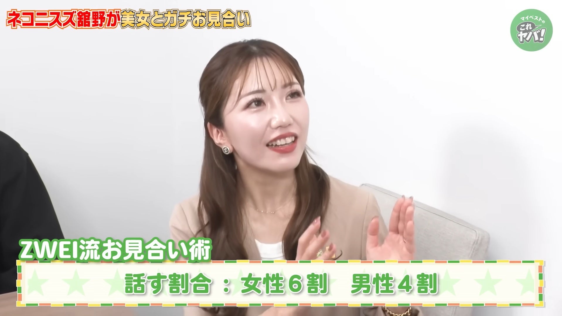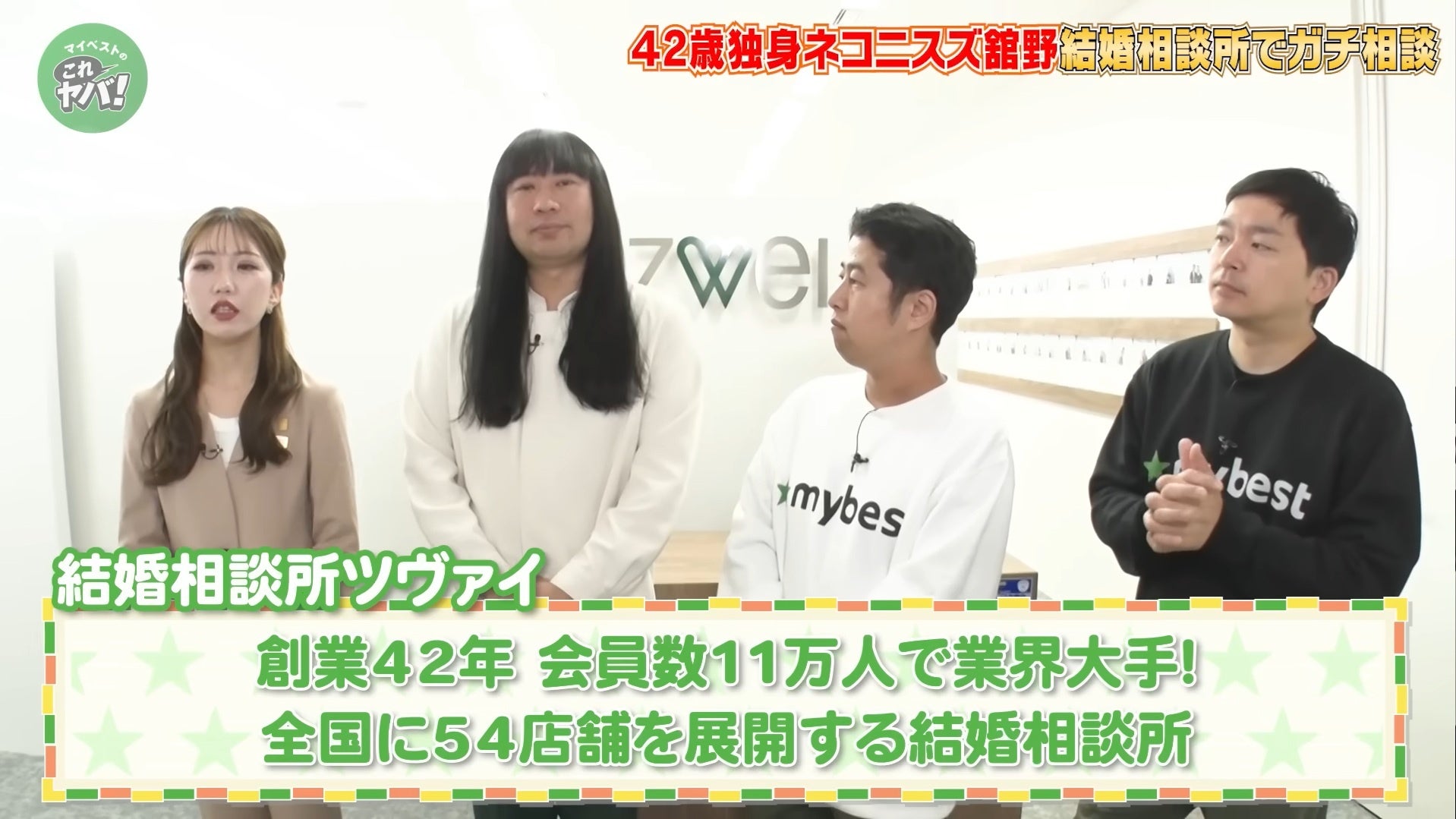 業界No.1の成婚数(*1)を誇る株式会社ZWEI(ツヴァイ)(本社:東京都中央区、代表取締役社長:橋爪 みずほ、以下「ZWEI」)は、商品比較サービス「マイベスト」を運営する株式会社マイベスト(本社:東京都中央区、代表取締役社長CEO:吉川 徹)が配信する公式YouTubeチャンネルにて、お笑い芸人のウエストランドのお二人とネコニスズ・舘野さんが結婚相談所サービスの実態を調査する動画に、業界大手の結婚相談所として撮影協力しました。