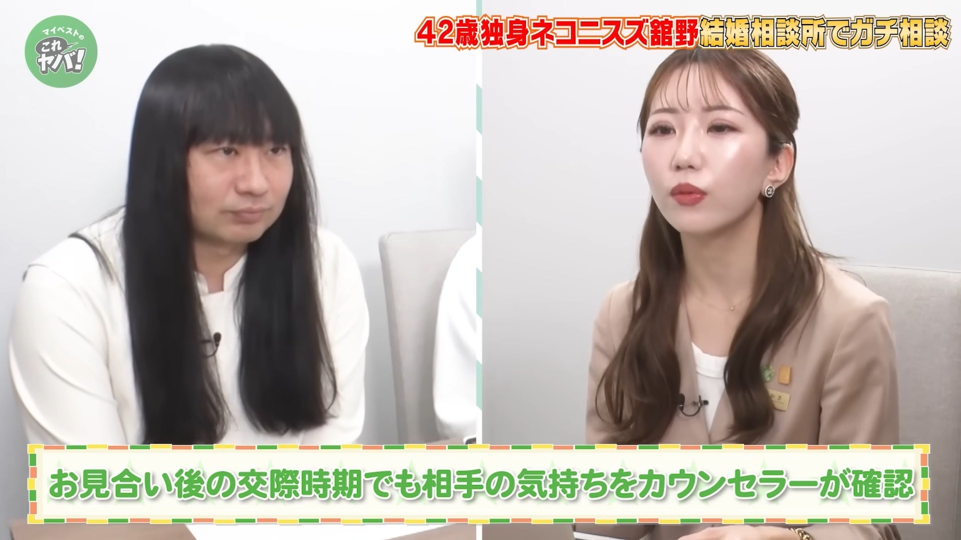 舘野さんの悩みに寄り添いながら魅力を引き出していく様子や、婚活中の方にとって参考になるアドバイスも見どころです。カウンセリングとお見合いの様子は、マイベスト公式YouTubeチャンネル「マイベストのこれヤバ!」にてご覧いただけます。