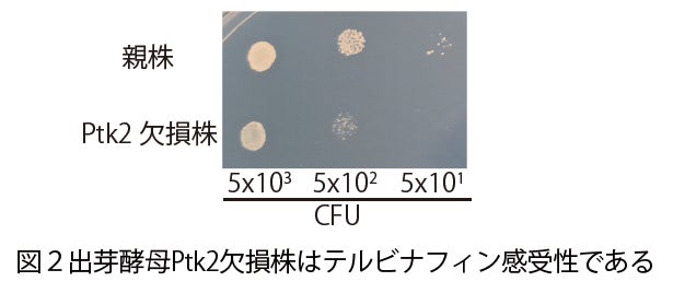 新たな抗真菌薬標的を探索するため、遺伝子組換え技術を用いて、白癬菌のもつ機能未知タンパク質TrPtk2を欠損させた変異株を作出したところ、野生株(遺伝子組換えをしていない元の菌株)と比べ、TrPtk2欠損株ではテルビナフィンを加えた培地*2における菌の成長が抑制される状態(感受性)になることが分かりました(図1)。 白癬菌以外の真菌も感染症を引き起こし、臨床上問題となります。そこで、白癬菌だけでなく他の真菌種においてもPtk2がテルビナフィンの自然耐性に関与するかを知るために、一般的に実験室で用いられている真菌の一種である出芽酵母を用いて調査しました。