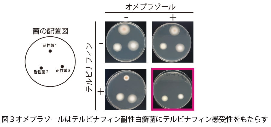Ptk2は、細胞膜上のプロトンポンプPma1を活性化することが知られています。白癬菌のTrPtk2もプロトンポンプPma1を活性化し、テルビナフィン耐性をもたらすのではないかと考え、プロトンポンプ阻害剤として知られる胃酸抑制薬オメプラゾールを作用させた際のテルビナフィン感受性を確認しました。その結果、テルビナフィン耐性白癬菌においてテルビナフィンに部分的な感受性を示すことがわかりました(図3)。