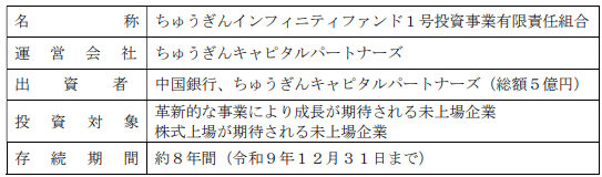 当行ならびにちゅうぎんキャピタルパートナーズ(岡山市北区丸の内一丁目15番20号ちゅうぎん本店ビル9階 代表取締役 小橋 栄紀)は、スタートアップ企業を出資対象とする『ちゅうぎんインフィニティファンド』が、株式会社Soilook(香川県高松市 代表取締役 西藤 翼)のJ-KISS型新株予約権を引受けましたことをお知らせ致します。