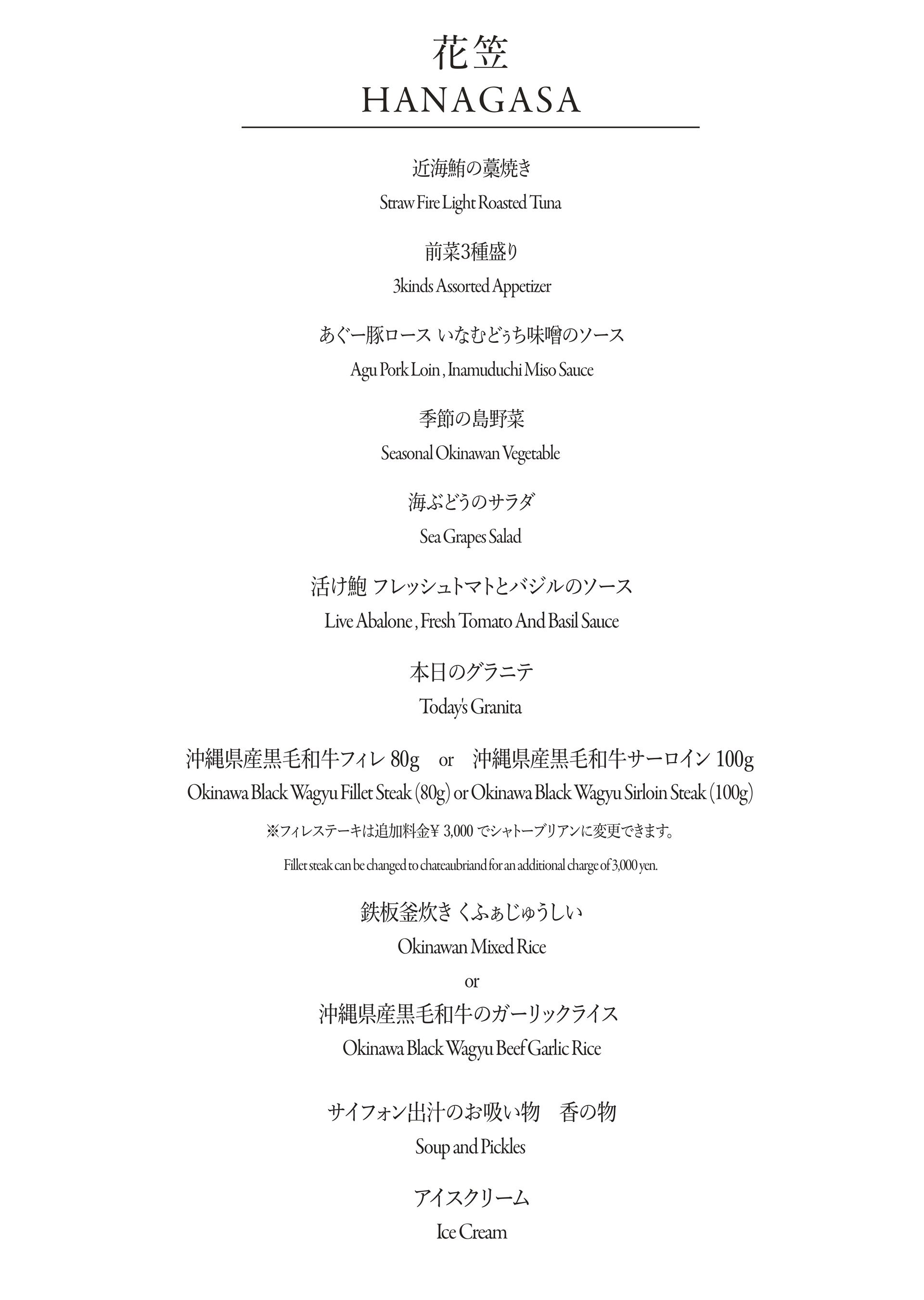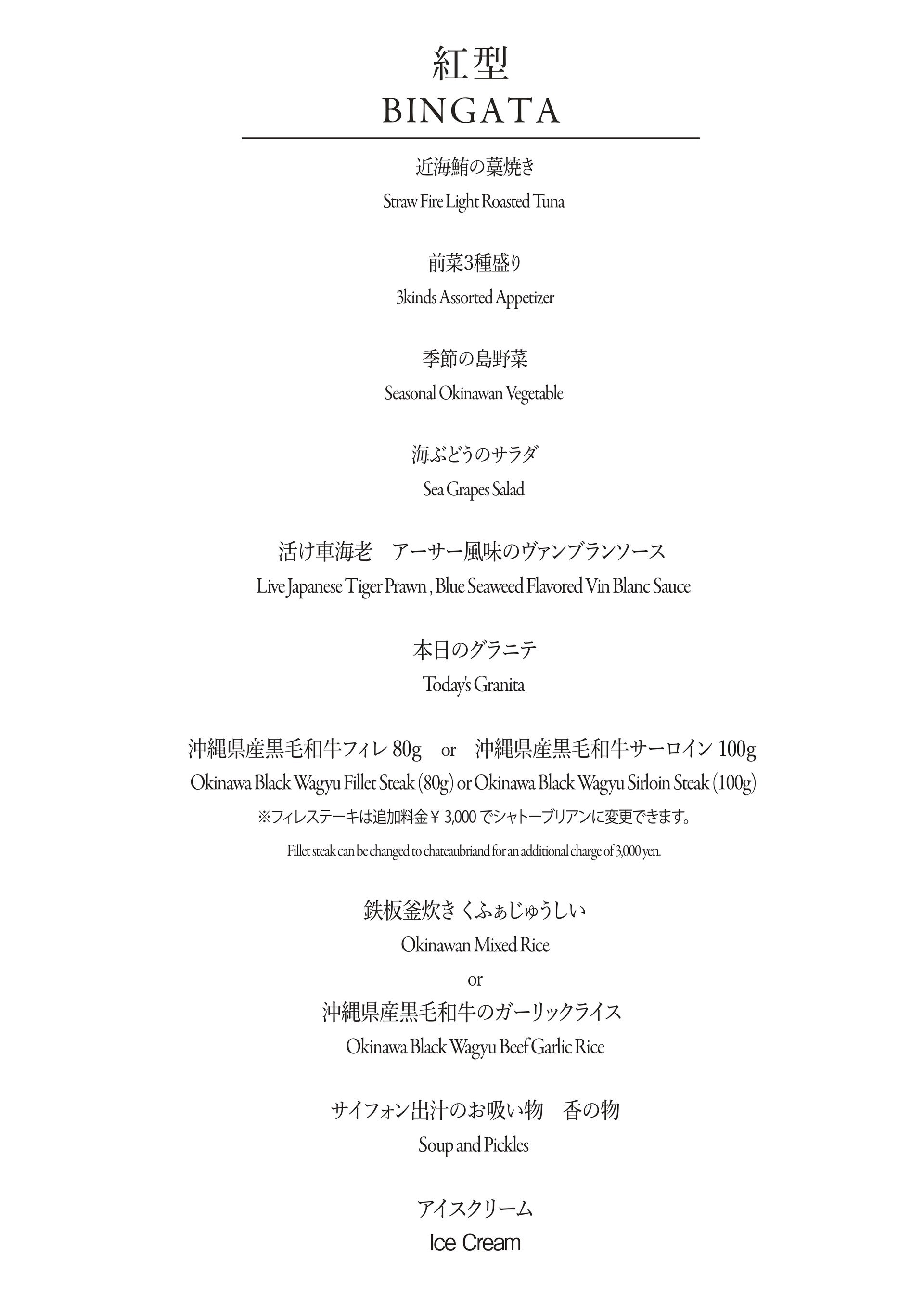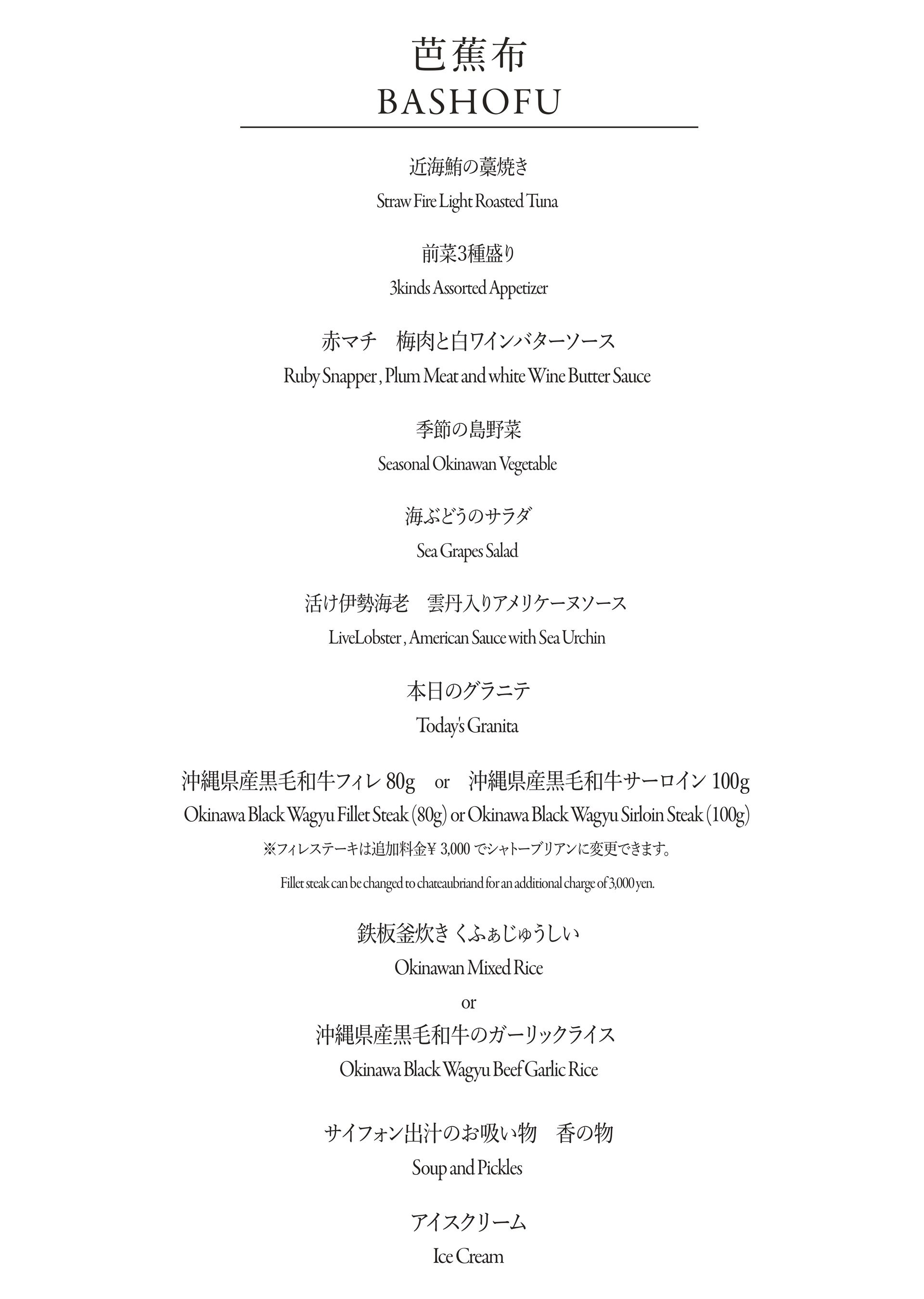 沖縄県産⿊⽑和⽜と沖縄近海で獲れた新鮮な「活き」の海鮮、季節の島野菜を、一皿一皿お客様の前で食材の魅力を最大限に引き出した鉄板焼きのフルコースをご提供します。拘り選び抜いた⾷材はもちろん、シェフが⽬の前で「魅せる」ライブパフォーマンスと⾷事に花を添える楽しい会話にもご期待ください。美しい⼣陽もご覧いただける贅沢な空間で皆様をお待ちしております。