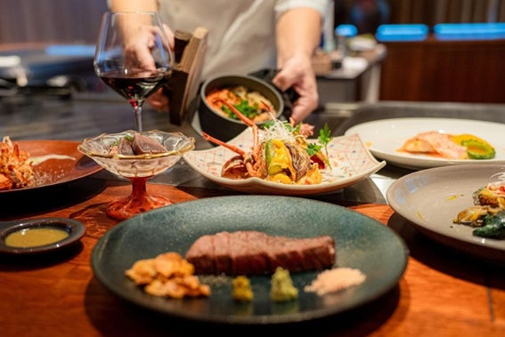 サンフロンティアホテルマネジメント株式会社が運営する「HIYORI オーシャンリゾート沖縄」(https://okinawa-hiyoriocean.jp)1階のレストラン「鉄板焼き 善」では、沖縄の三大高級魚「赤マチ」や「活け伊勢海老」、「あぐー豚」などの豪華食材の数々をお客様の目の前で焼き上げる、ライブ感溢れる夏季限定の鉄板焼きディナーコース4種類を、8⽉31⽇(⽇)までご提供します。