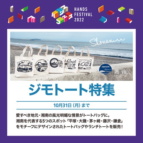 愛すべき地元・湘南の風光明媚な情景がトートバッグに。湘南を代表する5つのスポット「平塚・大磯・茅ヶ崎・藤沢・鎌倉」をモチーフにデザインされたトートバッグやランチトートを販売いたします。対象のジモトートバッグをお買い上げのお客様に平塚オリジナルステッカーをプレゼントいたします。(※無くなり次第終了)
