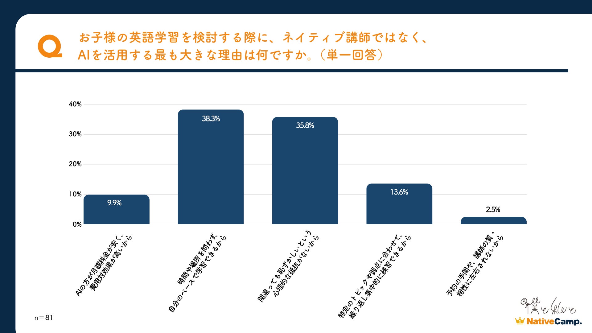 まずは、英語学習の入口としてはAIを使い、そこから一歩進んだ、対人での会話経験を得たい段階になるとネイティブ講師を選択する。今回の調査からは、こうした“段階に応じた学習の使い分け”を意識する保護者の姿勢もうかがえました。