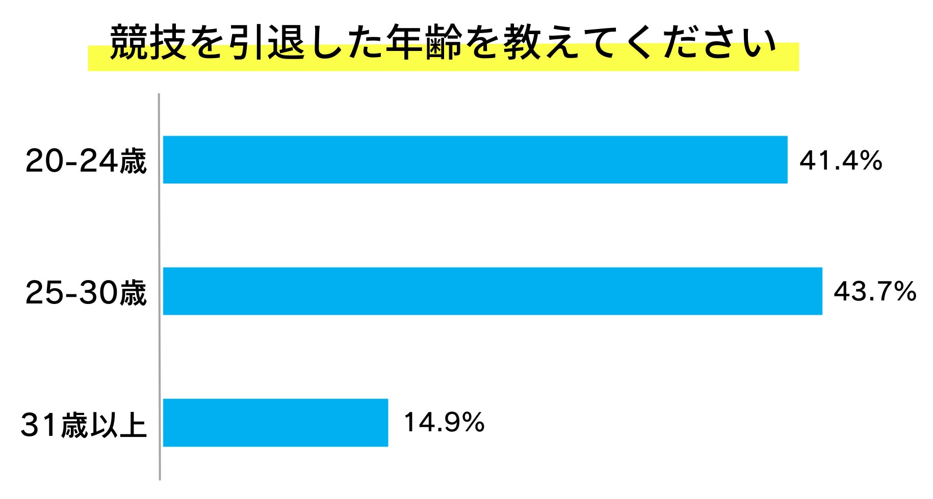 現状を把握するためはじめに「引退した年齢」を確認したところ、20-24歳が41.4%、25-29歳が43.7%と20代で競技を引退した人が85.1%となりました。