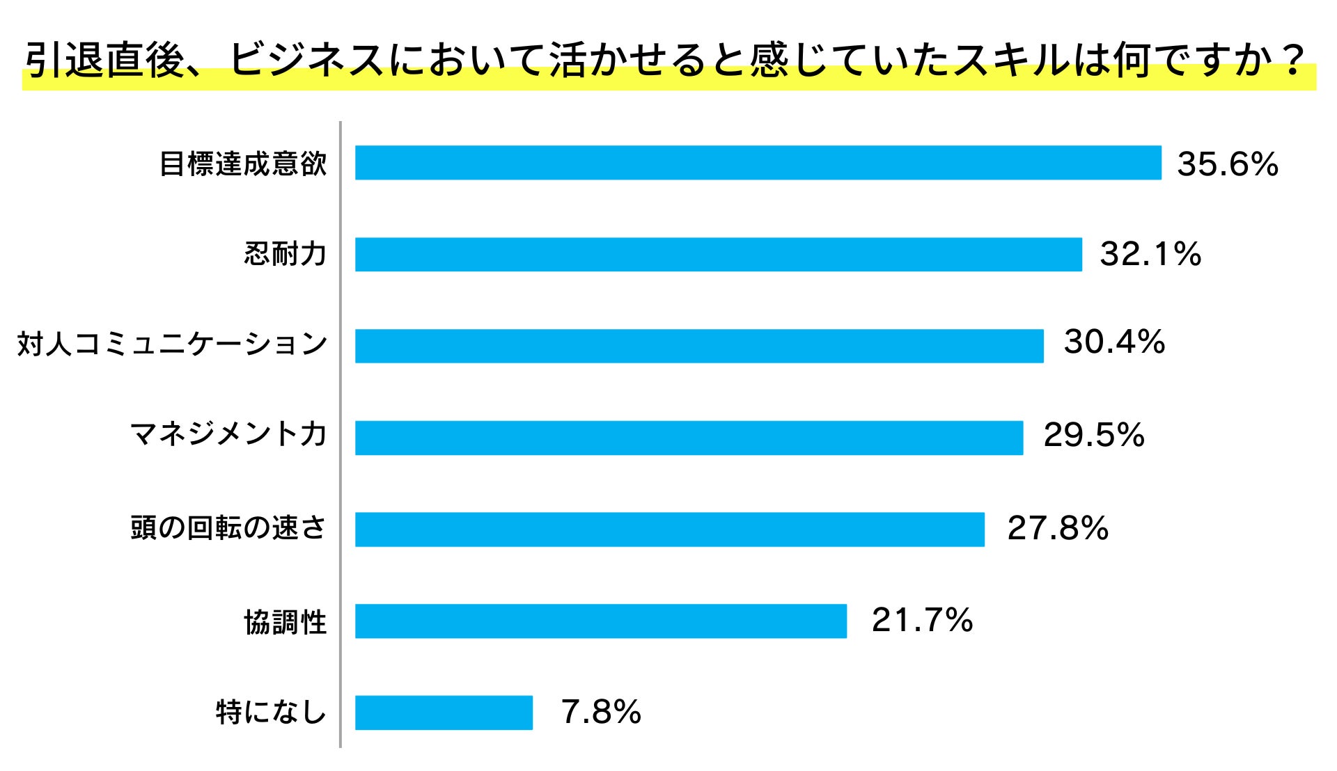 セカンドキャリアについて多くのアスリートが不安を抱えている一方で、競技に向き合ってきたことはストロングポイントにも十分になり得ると考えられます。ここでは、競技生活で培ったスキルの中でビジネスにも活かせると考えているものを確認しました。