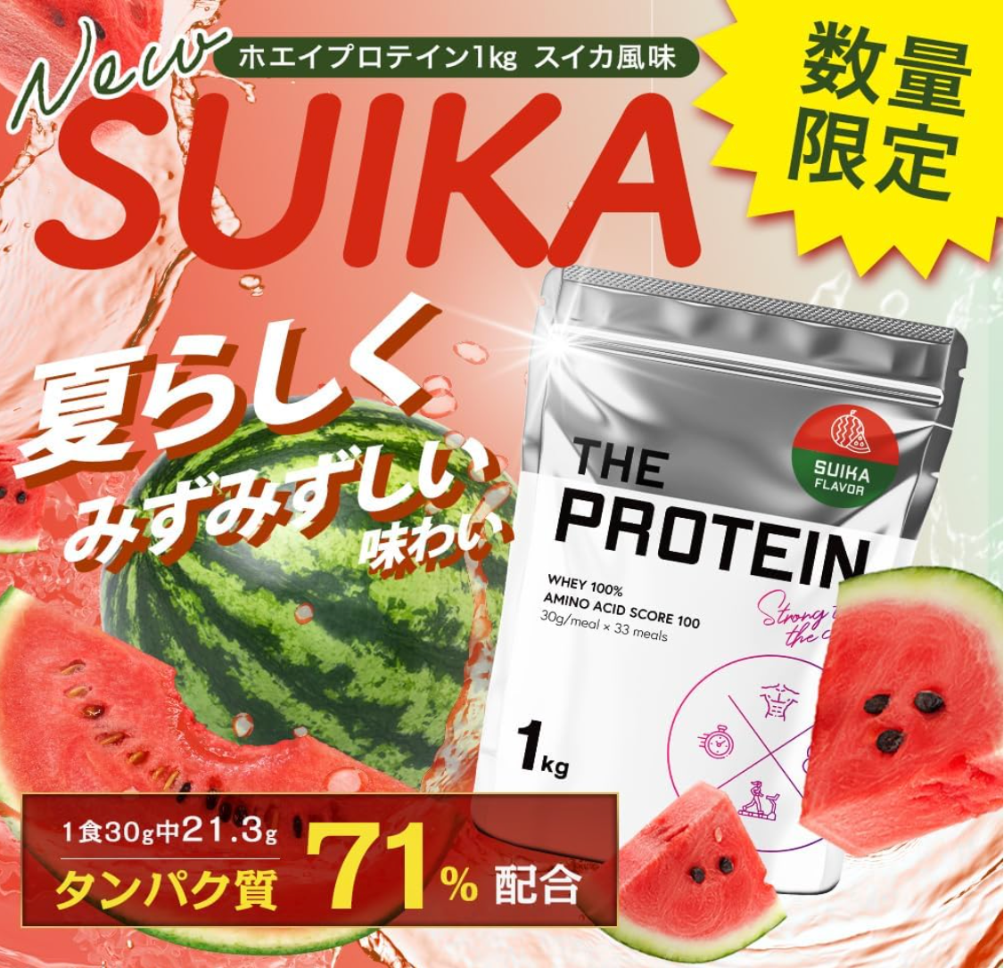 THE PROTEIN(通称:ザプロ)公式ショップでのメルマガ会員に対して行った「夏に飲みたいWPCプロテインは?」のアンケートで2位に輝いた「スイカ」を数量限定でフレーバー化しました。アンケートで1位はラムネ風味だったのですが既存商品にソーダ風味が既にあるため2位の投票数を集めたフレーバーを商品化することを決めました。お水でさっぱりと飲んでも良し、炭酸水割もおすすめです。少量の水で溶かした後に炭酸水を注いでゆっくりとシェイカーをひっくり返すと完成するので是非、お試しください!!