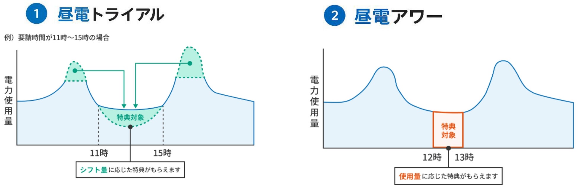 ① 昼電トライアル:お客様ごとに標準的な電力使用量を設定し、実施日における電力使用量と比較して、変化量を判定する。 |