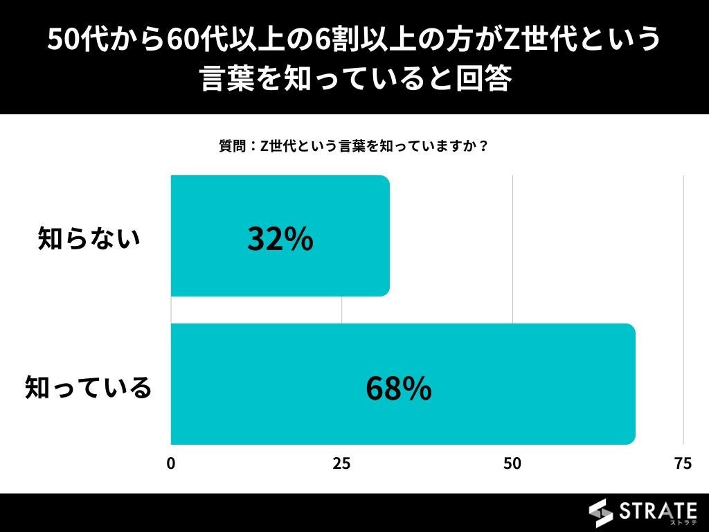 50代~60代以上の男女を対象とした「Z世代という言葉を知っていますか?」というアンケートで最も多かった回答は「知っている」で68%でした。