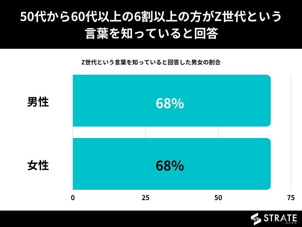 50代から60代以上の男女のZ世代という言葉を知っていると回答した割合を男女別でみてみますと、男性が68%、女性が68%という結果になりました。