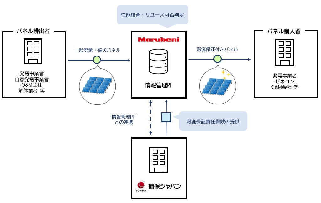 本合意書は、丸紅が環境省実証事業※1を通じて構築中の情報管理プラットフォーム(以下、「情報管理PF」)を介して2023年度から販売開始を予定している使用済太陽光パネルに対し、損保ジャパンが瑕疵保証責任保険を付保する仕組みを構築するものです。