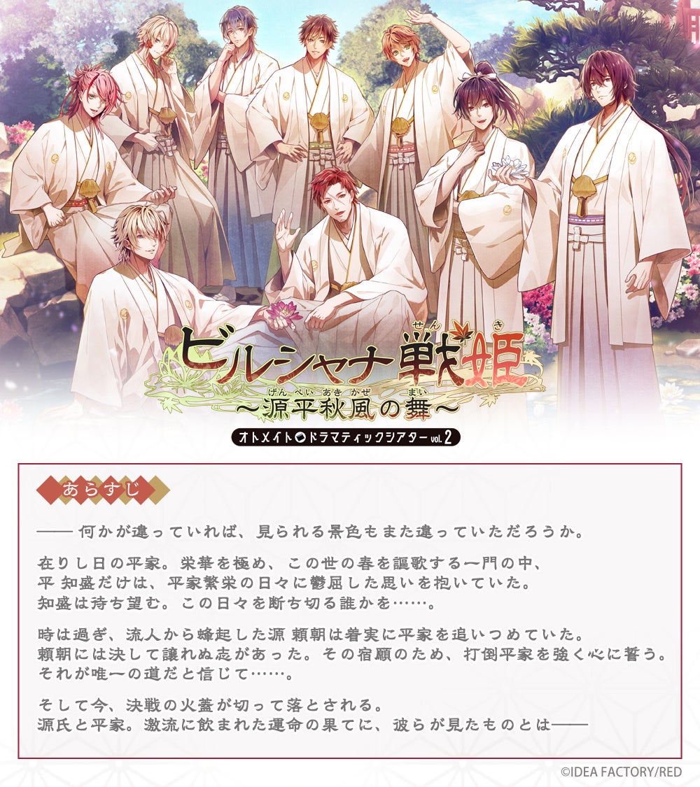 アイディアファクトリー株式会社の女性向けゲームブランド「オトメイト」より、2022年10月9日(日)開催予定のオトメイトドラマティックシアター vol.02「ビルシャナ戦姫 ~源平秋風の舞~」につきまして、明日9月3日(土)~4日(日)の2日間限定で「オトメイトパーティー2022」来場者特別先行抽選を実施することをお知らせ致します。