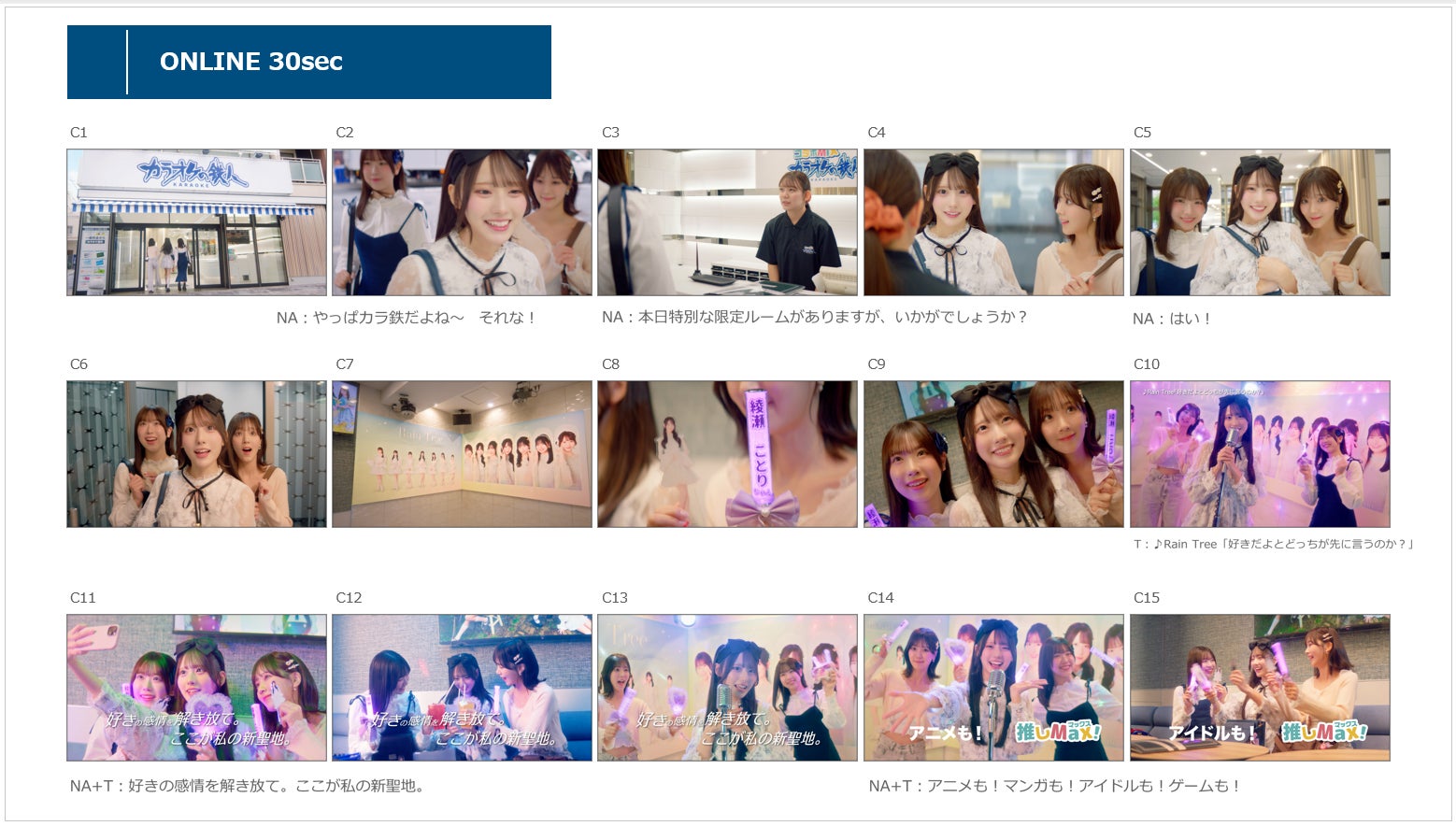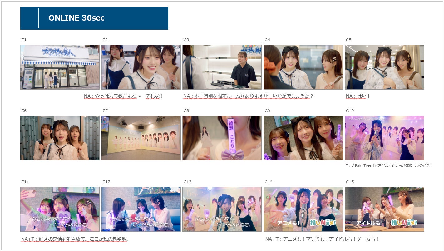 株式会社鉄人エンタープライズ(所在地:東京都目黒区、代表取締役社長:兒玉 智之)は、カラオケの鉄人 コラボミックスの新CM「ここが私の新聖地。」篇を、11月14日(金)より公開致します。本CMには、デビュー後初の単独CM出演となるガールズグループ「Rain Tree」の綾瀬ことりさんが登場。友人とカラオケに訪れた際に特別な体験へと案内され、コラボルームでの推しグッズを見せ合う様子や、コラボドリンクを楽しむ瞬間、惹きつけるカラオケの様子など、全力で推し活を楽しむ姿を描きます。Rain Tree 3rdデジタルシングル「好きだよとどっちが先に言うのか?」を楽曲に起用し、"好き"という感情をまっすぐ外へ解き放てる場所である魅力を伝えていきます。