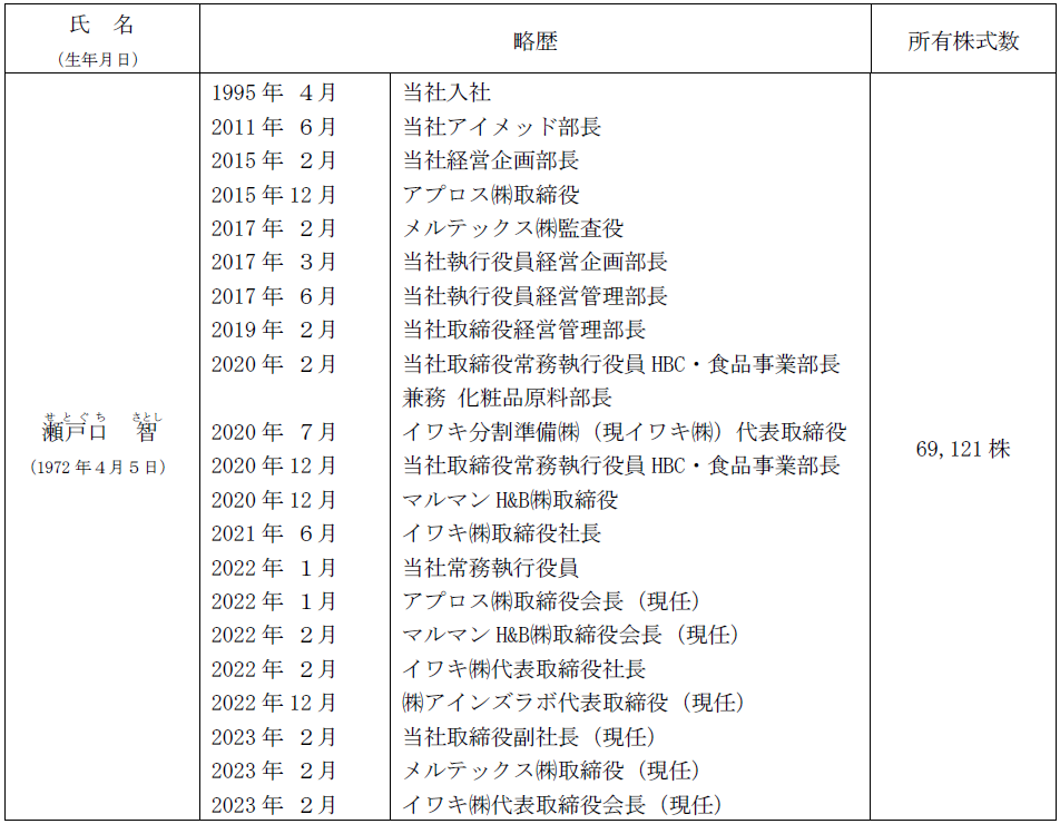 なお、新しく代表取締役社長に就任する予定の瀬戸口智は、当時イワキ株式会社(現アステナホールディングス株式会社)に入社以来、営業部門や管理部門等幅広い分野に携わってまいりました。さらに、前期までHBC・食品事業の責任者(イワキ株式会社代表取締役)として、事業の買収、一般用医薬品卸売事業からの撤退等構造改革を推し進め、黒字化を達成するなど、経営の手腕も発揮しております。その豊富な経験と実績に基づき、ホールディングスにおいても力強いリーダーシップを発揮するものと確信しております。
