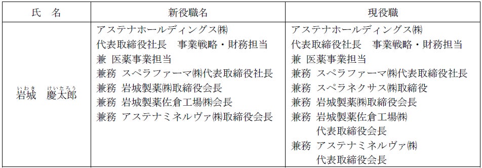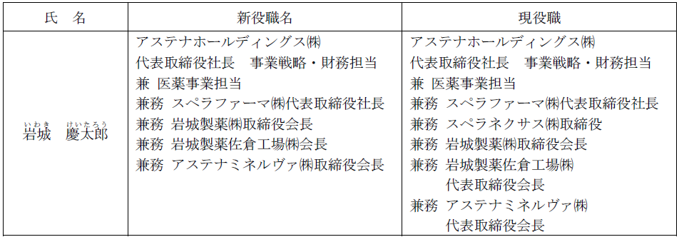 当社は2020年にスペラファーマ株式会社と岩城製薬佐倉工場株式会社をグループに迎え、3年間に亘り両社への投資を行うと共に事業基盤の強化を行ってまいりました。これらの事業活動は、当グループの成長に大きく資するものであると確信する一方、特に高活性注射剤の操業が始まる来年度(2024年11月期)は両社のより大きな事業シナジー創出に向けた大変重要な年度になると認識しております。ついては、現代表取締役社長が、持株会社であるアステナホールディングス株式会社と、事業会社であるスペラファーマ株式会社および岩城製薬佐倉工場株式会社の代表取締役を兼務している状況を解消することで、いわゆる経営と執行の分離を行い、また両社を取得する段階からその後の投資判断に至るまで主体的に関与した現代表取締役が自ら当該事業をけん引することで、ファインケミカル事業の全体の事業成長を加速させる考えです。