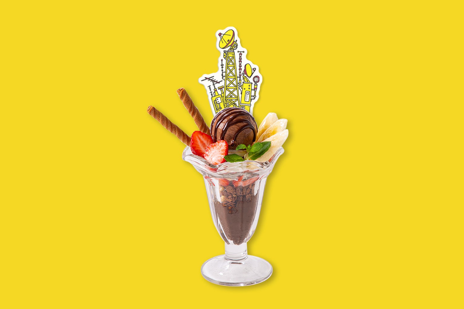 いちごやバナナの乗ったチョコレートパフェに刺さっているのは……アンテナ!?