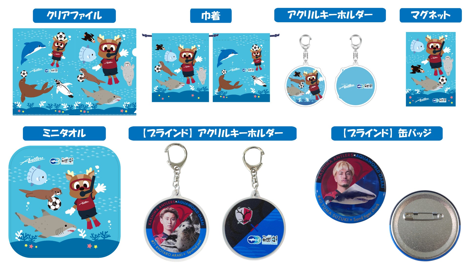 海の生きものたちと鹿島アントラーズの特別コラボグッズを販売します。クラブマスコットであるアントンと海のいきもののイラストが描かれたグッズや、選手とサメやイルカ、アシカ、ペンギンたちなどがデザインされたランダム缶バッジ・ランダムキーホルダーもご用意しました。いずれも数量限定での販売となりますので、ぜひお早めにお買い求めください。
