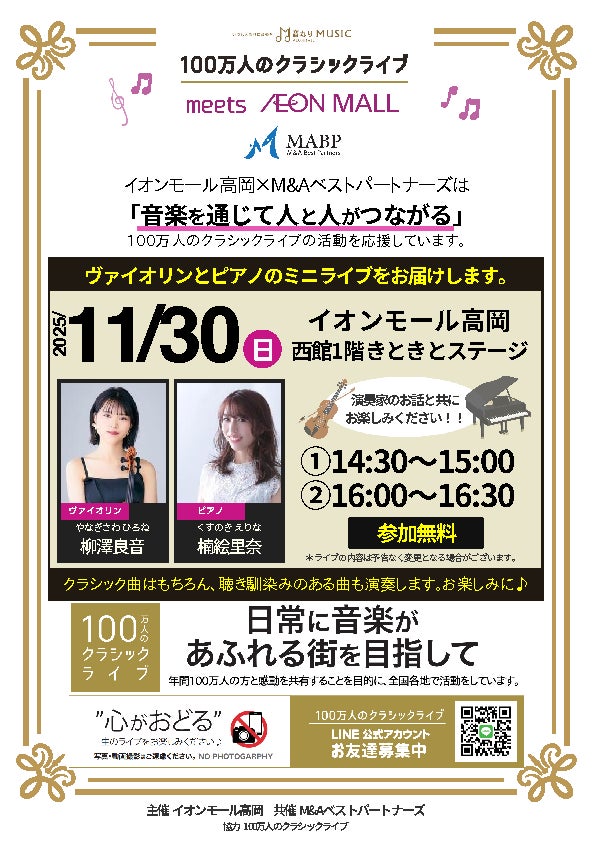 製造、建設、不動産、医療・ヘルスケア、物流、ITに特化したM&A仲介を⾏う株式会社M&Aベストパートナー(本社:東京都千代田区、代表取締役社長:齋藤 達雄 以下M&Aベストパートナーズ)と、一般財団法人100万人のクラシックライブ(東京都千代田区、代表理事:蓑田秀策 以下100万人のクラシックライブ)は、11月30日(日)14:30/16:00より、イオンモール高岡にて、クラシックライブを開催することをお知らせいたします。