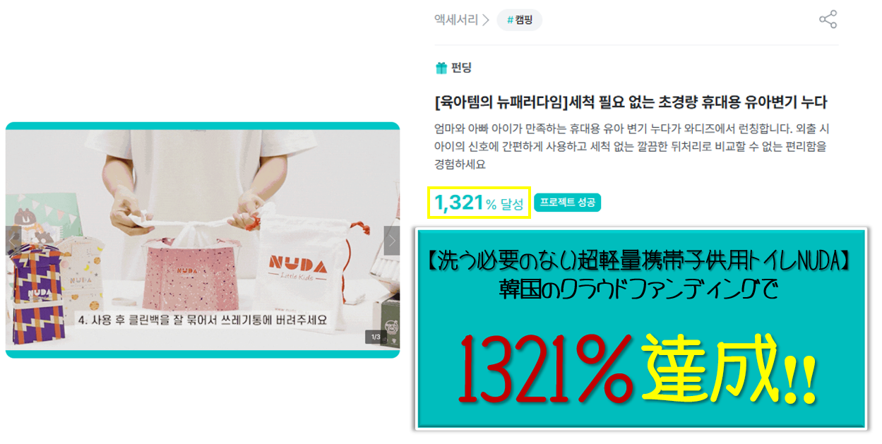 韓国クラウドファンディングで1321%達成した話題の商品!~開くだけでトイレになる。夢のような外出を叶える育児必須アイテム!子供用携帯トイレNUDA~