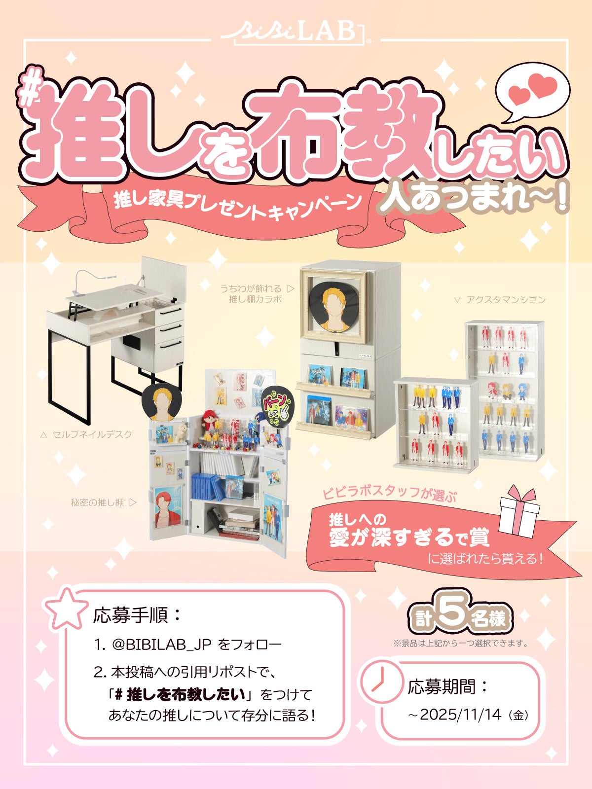 弊社趣味グッズブランド「BIBILAB®(ビビラボ)」は、11月4日の「いい推しの日」を記念したSNSキャンペーンを開催いたします。推し活をより楽しく便利にする【ビビファボ】シリーズより、4製品が景品としてラインナップ。合計5名様に「推し家具」をプレゼントいたします。愛する推しを引用リポストで布教して、豪華景品をゲットしましょう!